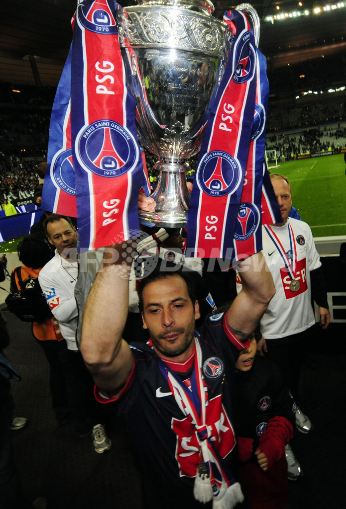サッカー・フランス杯2009-10(%%French League Cup 2009-10%%)決勝が1日、サン・ドニのスタッド・ド・フランス(Stade de France)で行われ、パリ・サンジェルマン(%%Paris Saint-Germain%%)が延長戦の末1-0でASモナコ(%%AS Monaco%%)に勝利し、8度目の優勝を果たした。写真は優勝を果たし、トロフィーを掲げるパリ・サンジェルマンのルドヴィク・ジュリ(%%Ludovic Giuly%%)。(c)AFP/FRANCK FIFE