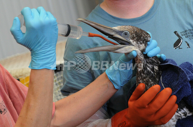 米フォートジャクソン(Fort Jackson)でシロカツオドリに水を与える鳥類研究所職員(2010年5月1日撮影)。(c)AFP/Mark RALSTON