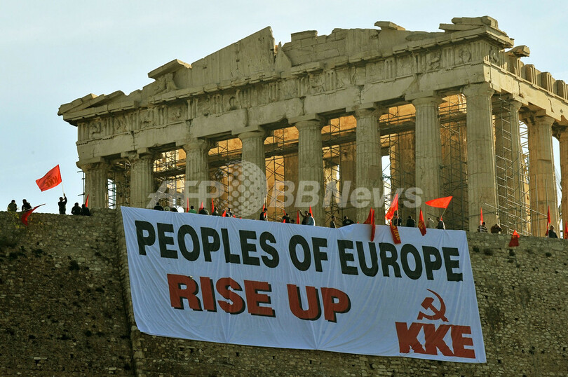各地で公務員数十万人が抗議行動を開始したのは4日。5日のギリシャ各地は公共交通がまひし、フェリーや旅客機も波止場や空港に止まったまま。各労組はさらなる財政支出削減と増税に抗議した。首都アテネ(Athens)の古代遺跡アクロポリス(Acropolis)では、共産党系の約200人が「欧州の民衆よ、立ち上がれ」と書かれた横断幕を掲げた。