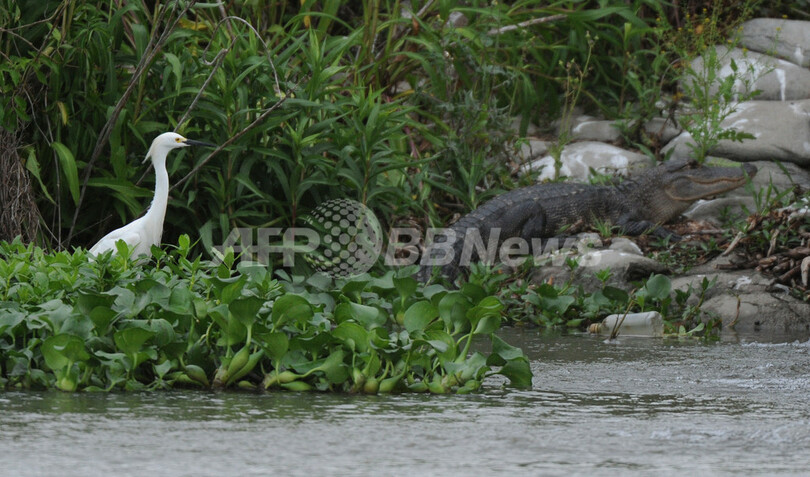 写真は、ミシシッピ川(Mississippi River)に隣接する湿地帯で撮影されたサギとアリゲーター(2010年4月29日撮影)。(c)AFP/Mark RALSTON