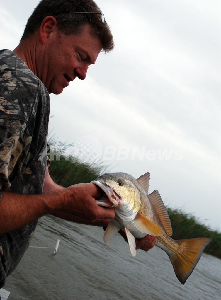 写真は、ミシシッピ川(Mississippi River)に隣接する湿地帯で、つり上げた魚を見せる男性(2010年5月3日撮影)。(c)AFP/MIRA OBERMAN