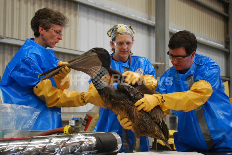 写真は、ルイジアナ州沖で保護されたカッショクペリカンの体についた原油を洗浄する鳥類保護団体関係者(2010年5月4日撮影)。(c)AFP/BY MIRA OBERMAN