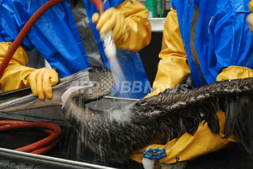写真は、ルイジアナ州沖で保護されたカッショクペリカンの体についた原油を洗浄する鳥類保護団体関係者(2010年5月4日撮影)。(c)AFP/BY MIRA OBERMAN
