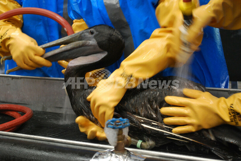 写真は、ルイジアナ州沖で保護されたカッショクペリカンの体についた原油を洗浄する鳥類保護団体関係者(2010年5月4日撮影)。(c)AFP/BY MIRA OBERMAN