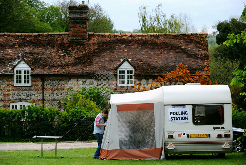 一方、シュロップシャー(Shropshire)州の有権者らは、「世界初の鉄橋」の料金所で投票。ハンプシャー(Hampshire)州フリート(Fleet)では、何とかやぶき屋根の民家が投票所に早変わりした。(c)AFP/Robin Millard