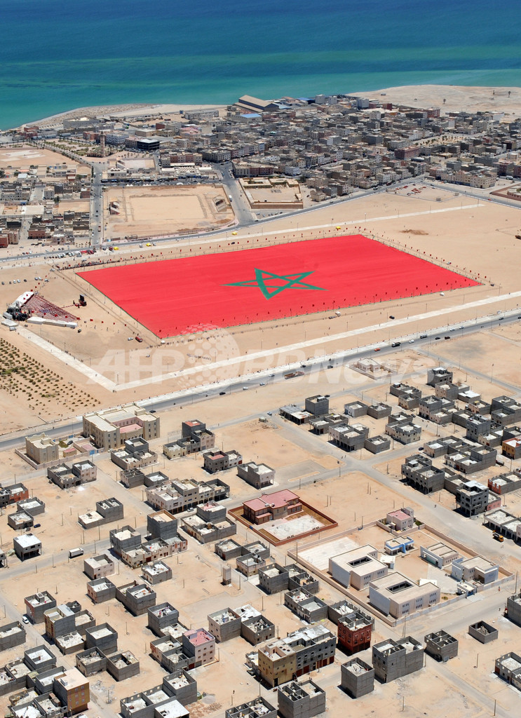 【5月9日 AFP】モロッコ人組織が8日、世界一大きい旗の記録更新を目指し、6万平方メートル、重量20トンの赤地の中央に緑の星を配置したモロッコ国旗を広げた。