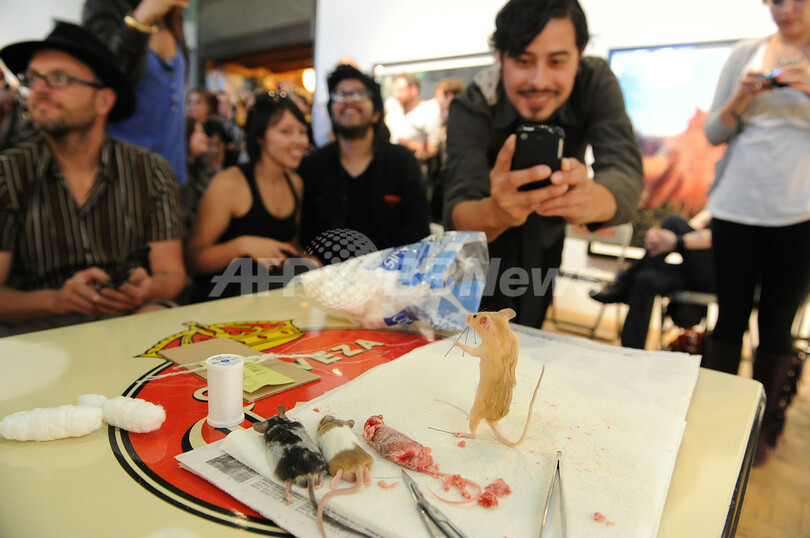 写真は、ギャラリーで催されたはく製制作の実演会で、はく製にされたばかりのネズミを記念撮影する来場者(2010年5月8日撮影)。(c)AFP/Robyn Beck