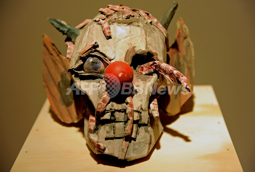 写真は、塗料、のり、段ボールを使った英国の芸術家ジェイク・アンド・ディノス・チャップマン(Jake and Dinos Chapman)氏製作の仮面(2010年5月11日撮影)。(c)AFP/Greg WOOD