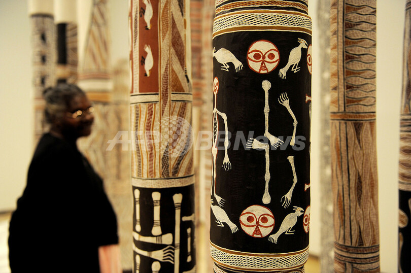 写真は、オーストラリア北東部アーネムランド(Arnhem Land)に住むヨルング(Yolngu)人による装飾が施された柱(2010年5月11日撮影)。(c)AFP/Greg WOOD