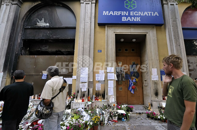 なお、政府の暫定予測によると、ギリシャの今年第1四半期の経済はやや持ち直し、国内総生産(GDP)は09年第4四半期と同じ、前期比0.8%減にとどまった。(c)AFP/Helene Colliopoulou