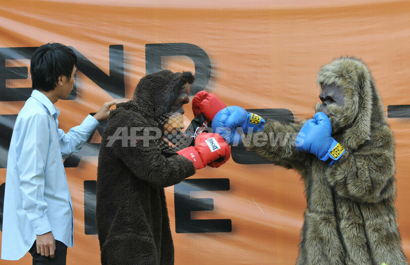 ボクシングの試合は、タイの私立動物園で実際に行われているというオランウータンのキックボクシングをまねたもので、COPメンバーは、インドネシアから連れ去られたとみられるオランウータン11頭をタイから取り戻すよう、インドネシア政府に要請した。オランウータンは、タイ当局が前年2月5日、動物園を捜索後も、タイ政府の保護下に置かれている。(c)AFP