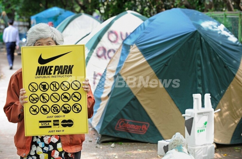 宮下公園はJR山手線(Yamanote Line)の線路脇にある約1ヘクタールの区立公園。高層ビルが建ち並ぶ渋谷の繁華街では数少ない緑地を提供しているが、渋谷区は数か月前、ナイキパーク計画のために公園に住んでいたホームレスの人たちを立ち退かせた。しかしその後、反対運動を行う数十人が公園内に住み着き、計画に抗議している。