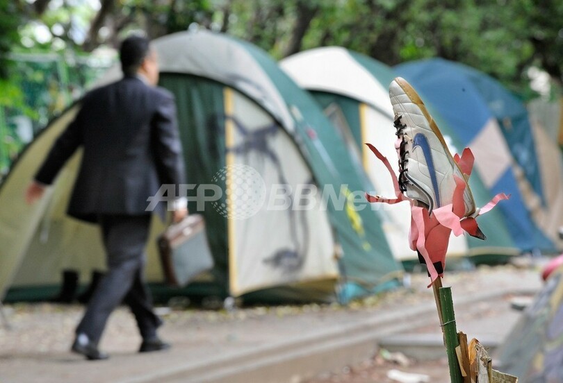 宮下公園はJR山手線(Yamanote Line)の線路脇にある約1ヘクタールの区立公園。高層ビルが建ち並ぶ渋谷の繁華街では数少ない緑地を提供しているが、渋谷区は数か月前、ナイキパーク計画のために公園に住んでいたホームレスの人たちを立ち退かせた。しかしその後、反対運動を行う数十人が公園内に住み着き、計画に抗議している。