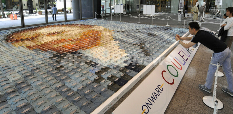 【5月16日 AFP】都内の丸の内で16日、アパレルメーカー、オンワード樫山(Onward Kashiyama)が24色のポロシャツ2070枚を並べて再現したビンセント・ファン・ゴッホ(Vincent Van Gogh)の自画像が展示されている。大きさは約10メートル四方。(c)AFP