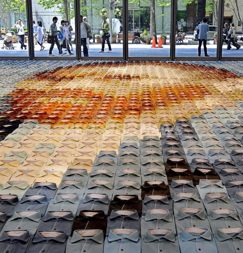 【5月16日 AFP】都内の丸の内で16日、アパレルメーカー、オンワード樫山(Onward Kashiyama)が24色のポロシャツ2070枚を並べて再現したビンセント・ファン・ゴッホ(Vincent Van Gogh)の自画像が展示されている。大きさは約10メートル四方。(c)AFP
