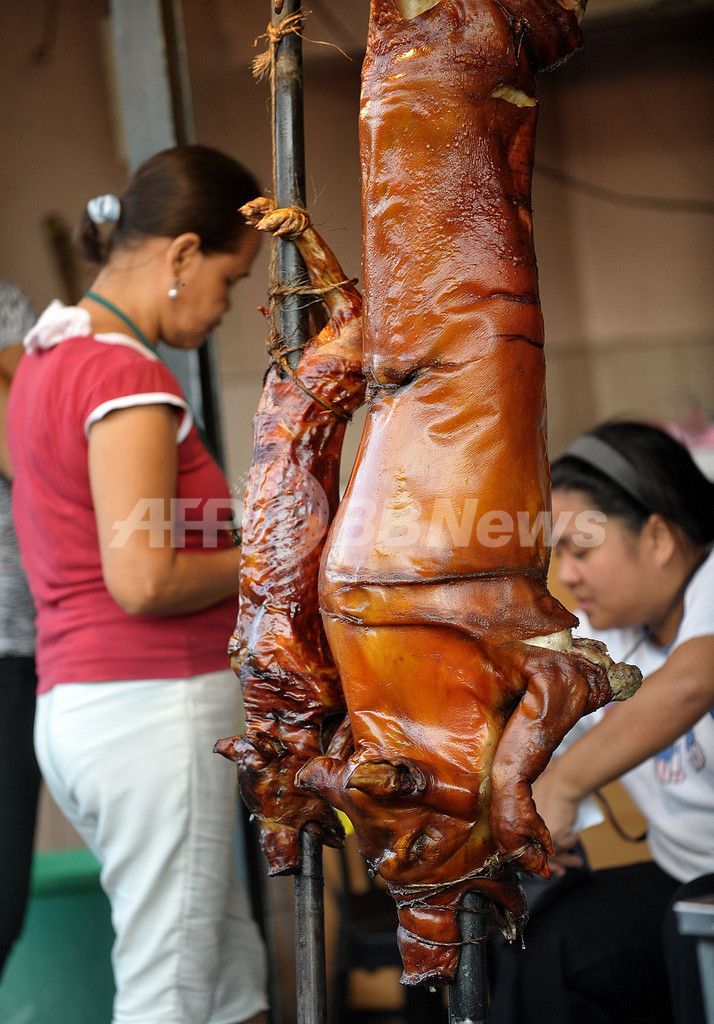 ニュース ライフ こぼれ話 ブタの丸焼き「レチョン」のパレード、フィリピン・マニラ 2010年5月17日 15:08 発信地:マニラ/フィリピン [ アジア・オセアニア フィリピン ] このニュースをシェア ‹ › ❮ 3/7 ❯ フィリピンの首都マニラ(Manila)のラロマ(La Loma)地区で16日、毎年恒例の祭りが行われ、「レチョン(lechon)」と呼ばれるブタの丸焼きのパレードが通りを練り歩いた。レチョンは、フィリピンで非常に人気のある食べ物で、中でもラロマ地区のレチョンは最もよく知られている。パレードでは、ユーモラスな格好をしたレチョンを見ることができる。写真は、同地区で販売されるレチョン(2010年5月16日撮影)。(c)AFP/JAY DIRECTO 画像作成中 ! 【5月17日 AFP】フィリピンの首都マニラ(Manila)のラロマ(La Loma)地区で16日、毎年恒例の祭りが行われ、「レチョン(lechon)」と呼ばれるブタの丸焼きのパレードが通りを練り歩いた。(c)AFP ライフ 一覧へ> メディア・報道関係・法人の方向け 写真・動画 購入のお問合せ>