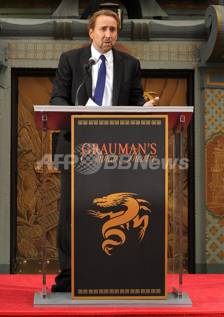 米カリフォルニア(California)州ハリウッド(Hollywood)にあるグローマンズ・チャイニーズ・シアター(Grauman's Chinese Theatre)前で17日、数々の人気テレビ番組や映画を手がけてきたプロデューサー、ジェリー・ブラッカイマー(Jerry Bruckheimer)が手形と足形をプレートに刻む記念式典が行われた。会場には、トム・クルーズ(Tom Cruise)やニコラス・ケイジ(Nicolas Cage)らも祝福に駆けつけた。写真は、スピーチを行うケイジ(2010年5月17日撮影)。(c)AFP/Getty Images/Kevin Winter