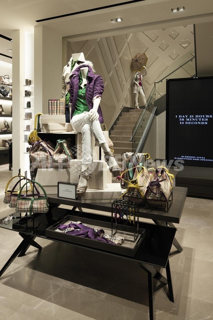 店舗は2フロアで、売り場面積は約400平方メートル。デニムやアウターを中心とした銀座マロニエ通り店限定の新ライン「バーバリー ブリット」をはじめ、インポートのバッグや小物、定番のトレンチコート、フレグランス、アイウェア、時計まで、直営店ならではの幅広いアイテムを展開する。