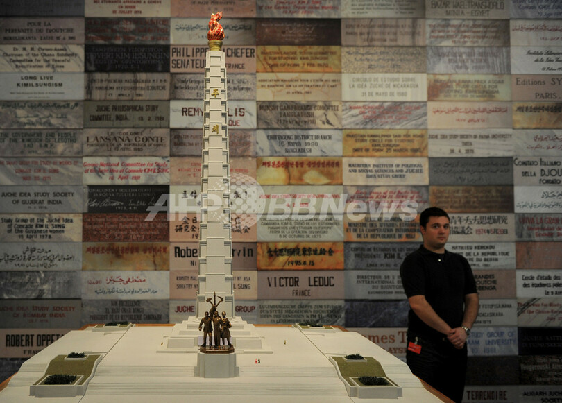 【5月19日 AFP】オーストリア・ウィーン(Vienna)の博物館で18日、北朝鮮の美術品などを紹介する特別展「金日成主席にささげる花(Flowers of Kim Il Sung)」が開幕した。展示品の中には、金正日(Kim Jong Il)総書記や故金日成主席の肖像画16点などが含まれているが、博物館関係者によると、こうした肖像画が北朝鮮国外で公開されるのは初めてだという。9月5日までの開催。(c)AFP/JOE KLAMAR