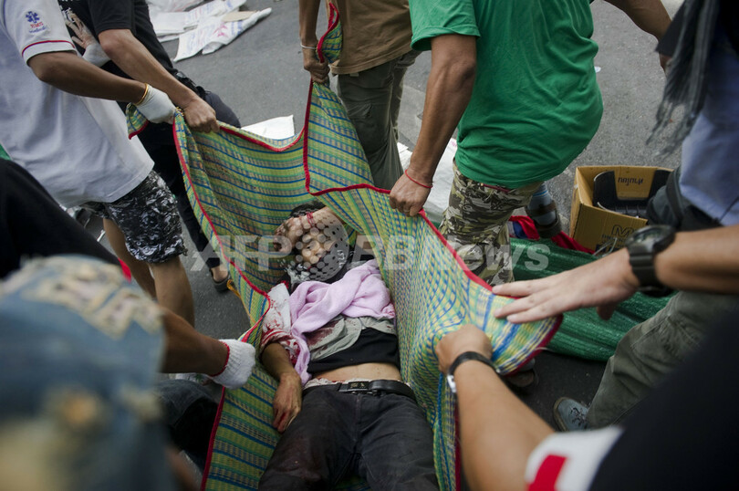 UDDがバンコク中心部の占拠を開始した3月中旬から19日までに、死者は少なくとも75人、負傷者は約1700人に達している。うち、前月10日のUDDと軍の衝突では25人が死亡している。(c)AFP/Anusak Konglang