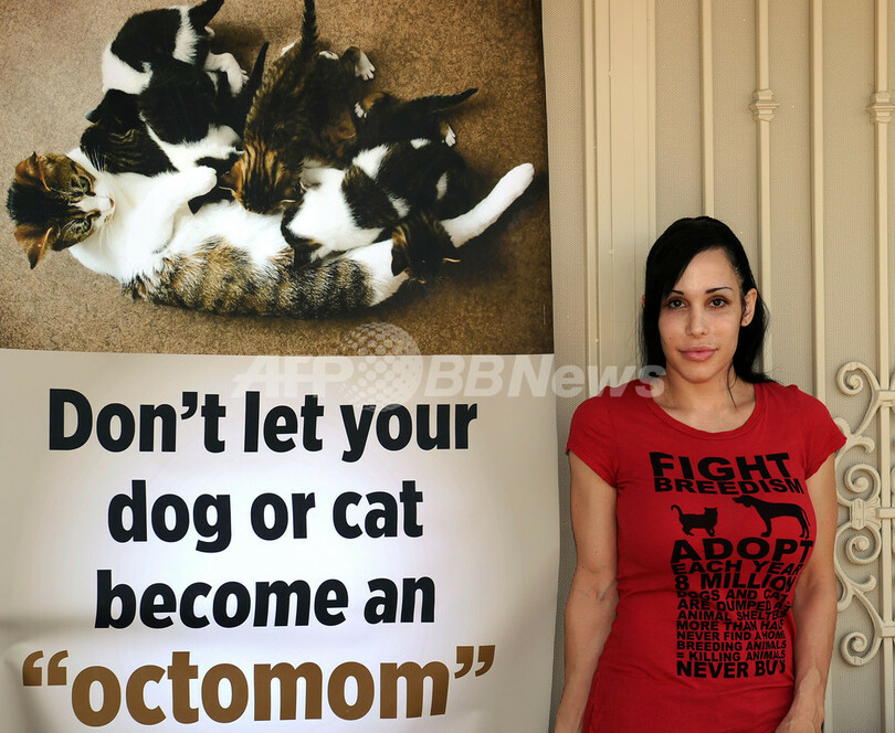 【5月20日 AFP】前年1月に体外受精で8つ子を出産した、「オクトマム(8つ子ママ)」のニックネームで知られるナディア・スールマン(Nadya Suleman)さん。ローン滞納で差し押さえの可能性が出ている米カリフォルニア州ラハブラ(La Habra)の自宅前に、「お宅のイヌやネコをオクトマムにしないように!」とアピールする国際動物愛護団体PETA(動物の倫理的扱いを求める人々の会)のポスターを掲げることを快諾し、19日、記念撮影に応じた。
