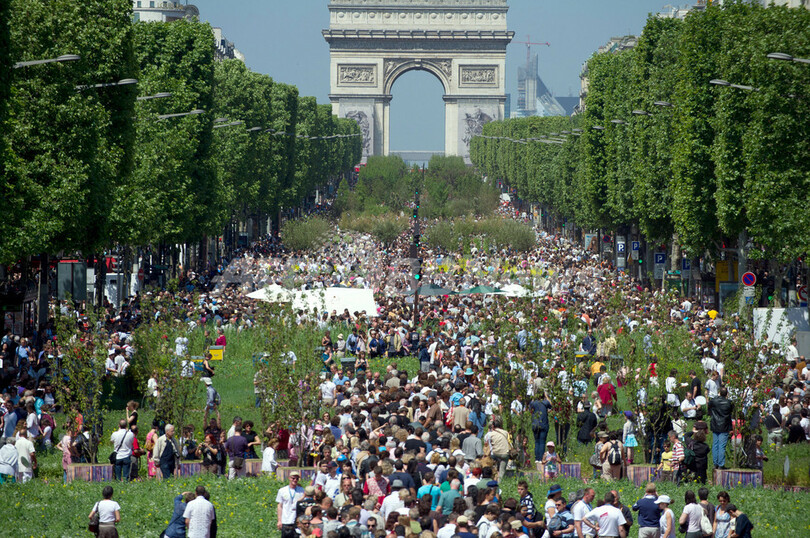 【5月24日 AFP】フランス・パリ(Paris)のシャンゼリゼ通り(Champs-Elysees) が23日、「巨大農園」に姿を変えた。24日まで開催される「ネイチャー・キャピタル(Nature Capital)」と呼ばれる農業イベントで、凱旋門(Arc de Triomphe)からコンコルド広場(Place de la Concorde)に向かう1.2キロが樹木や草花のほか、100種類以上の穀物、果物、野菜などで埋め尽くされた。牛や豚、山羊、羊などの家畜も姿を見せ、訪れた80万人の人たちの目を楽しませた。(c)AFP