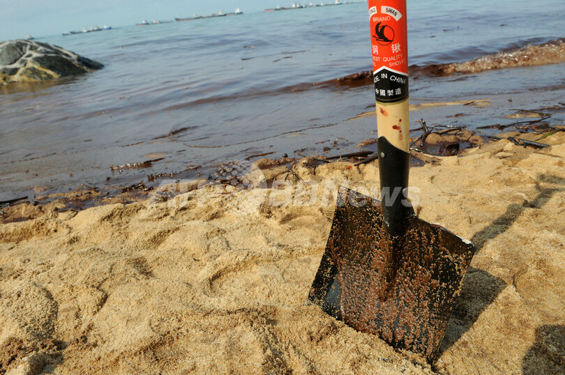 【5月26日 AFP】(写真追加)シンガポール東部沖で25日早朝、タンカーと貨物船が衝突し、破損したタンカーから原油約5000トンが流出した。