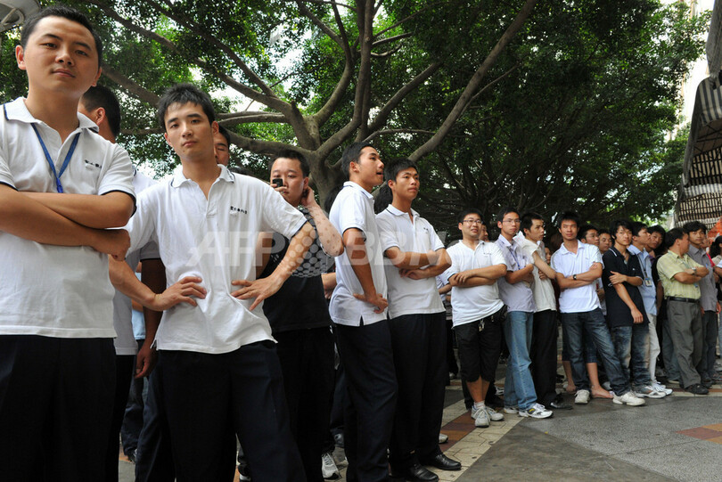 相次ぐ従業員の自殺で、中国各地に工場を持つ富士康の労働環境に対する疑問の声が高まっている。従業員らの証言や人権活動家らによると、富士康の深セン工場では30万~40万人が働いており、長時間労働や低賃金を強いられているという。(c)AFP