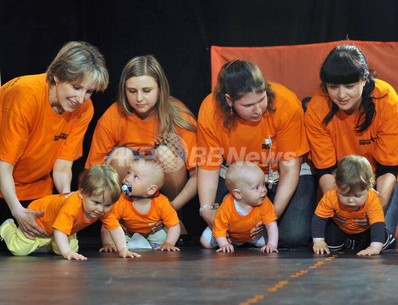 写真は、はいはい大会1歳部門に参加した赤ちゃんの体を支える母親(2010年5月31日撮影)。(c)AFP/SERGEI SUPINSKY