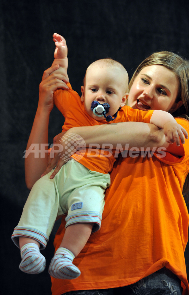写真は、はいはい大会で優勝した赤ちゃんを抱き上げる母親(2010年5月31日撮影)。(c)AFP/SERGEI SUPINSKY