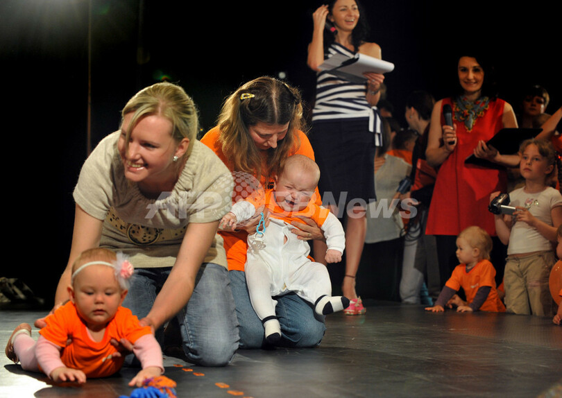 写真は、はいはい大会で赤ちゃんを抱き上げる母親(2010年5月31日撮影)。(c)AFP/SERGEI SUPINSKY