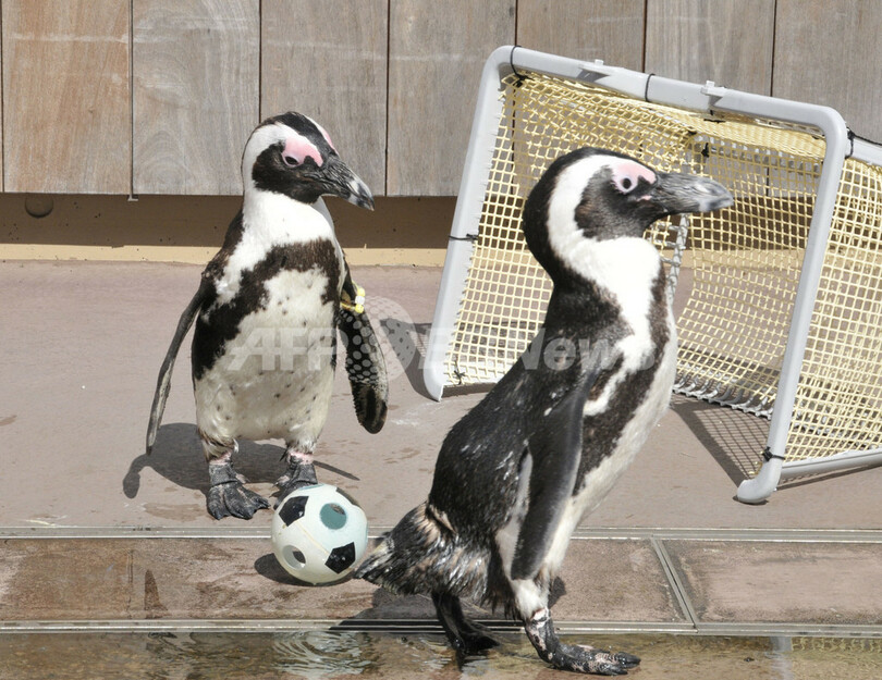 【6月2日 AFP】神奈川県の横浜・八景島シーパラダイス(Yokohma Hakkeijima Sea Paradise)で、2010年サッカーW杯南アフリカ大会(2010 World Cup)に合わせて、海の動物や魚たちによる「サッカーの祭典」が開催中だ。W杯開催国南アフリカ出身のケープペンギンによる「ペンギンサッカー」や、サッカーフィールドに見立てた水槽の中で魚たちがサッカーボール型のえさをつつき合う「おサッカーな選手権」を「観戦」できる。(c)AFP