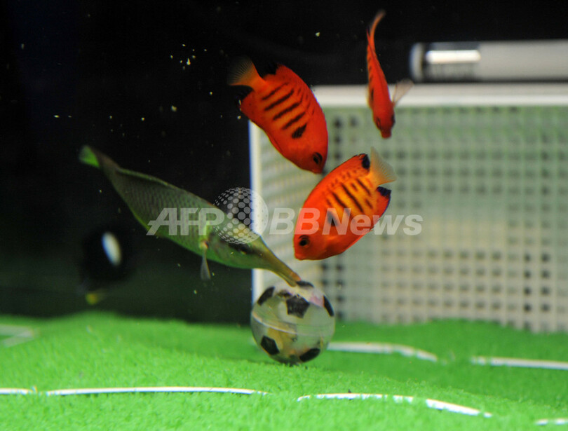 写真は、サッカー場に仕立てた水槽の中でサッカーボール型のえさをつつくクギベラとフレームエンゼルフィッシュ(2010年6月1日撮影)。(c)AFP/YOSHIKAZU TSUNO