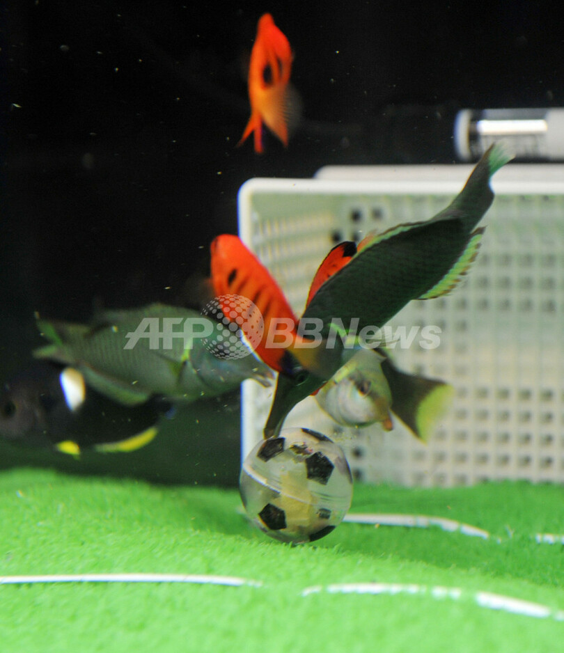 写真は、「おサッカーな選手権」でサッカーボール型のえさをつつくクギベラやフレームエンゼルフィッシュたち(2010年6月1日撮影)。(c)AFP/YOSHIKAZU TSUNO