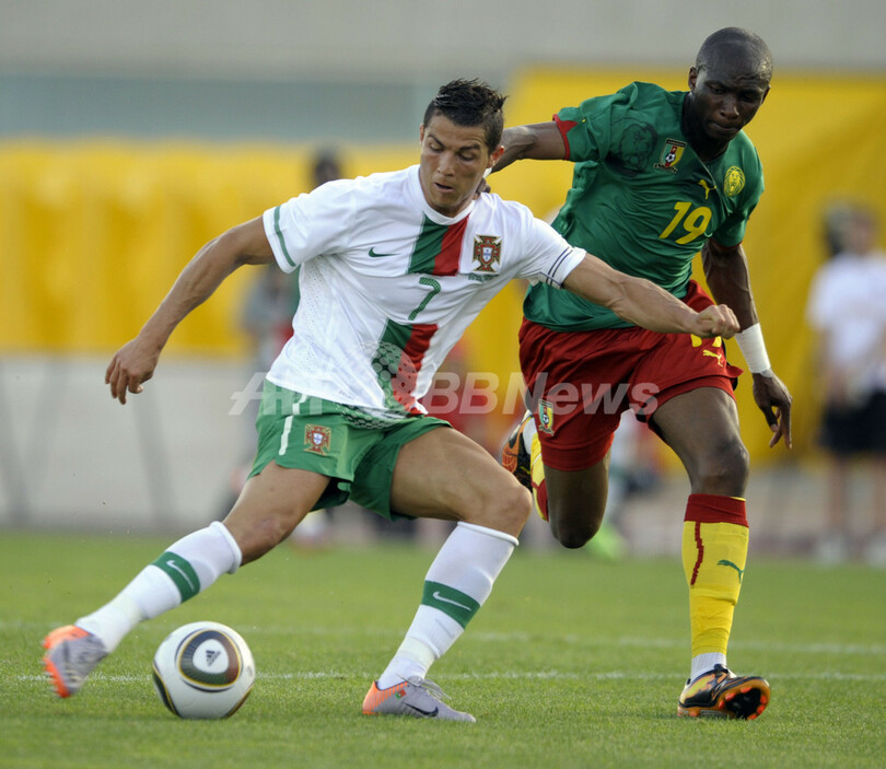 写真は、カメルーンのステファン・ムビア・エトゥンディ(Stephane Mbia Etoundi、右)をかわしてボールをキープするポルトガルのクリスティアーノ・ロナウド(Cristiano Ronaldo)(2010年6月1日撮影)。(c)AFP/MIGUEL RIOPA