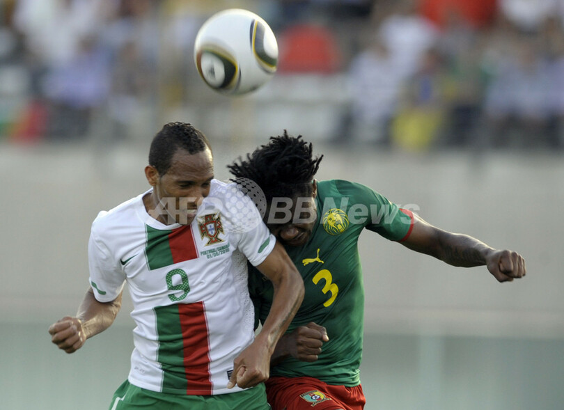 写真は、カメルーンのニコラ・ヌクル(Nicolas Nkoulou、右)とボールを競り合うポルトガルのリエジソン(Liedson Da Silva Muniz)(2010年6月1日撮影)。(c)AFP/MIGUEL RIOPA