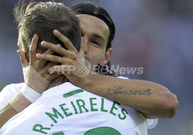 写真は、ゴールを決め、チームメイトのヌノ・ゴメス(Nuno Gomes)から祝福されるポルトガルのラウル・メイレレス(2010年6月1日撮影)。(c)AFP/MIGUEL RIOPA