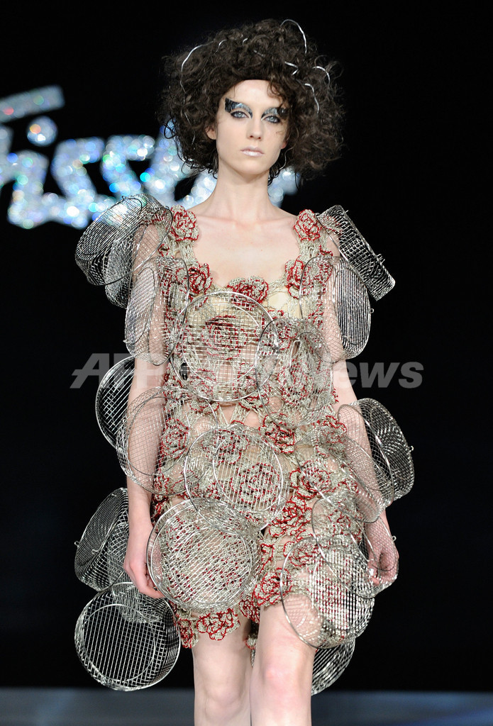 ランウェイには、東京コレクションに参加している2ブランド「ガッツ ダイナマイト キャバレーズ(GUT'S DYNAMITE CABARETS)」と「カミシマ チナミ(KAMISHIMA CHINAMI)」による、調理器具を使用してデザインした作品が発表された。(c)AFP