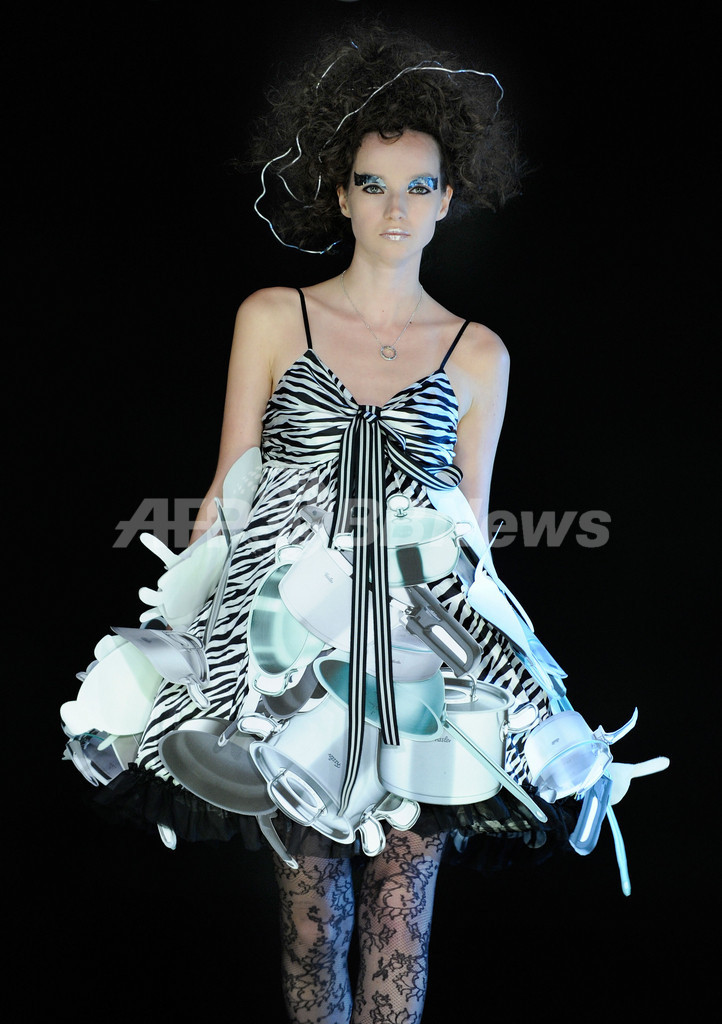 ランウェイには、東京コレクションに参加している2ブランド「ガッツ ダイナマイト キャバレーズ(GUT'S DYNAMITE CABARETS)」と「カミシマ チナミ(KAMISHIMA CHINAMI)」による、調理器具を使用してデザインした作品が発表された。(c)AFP