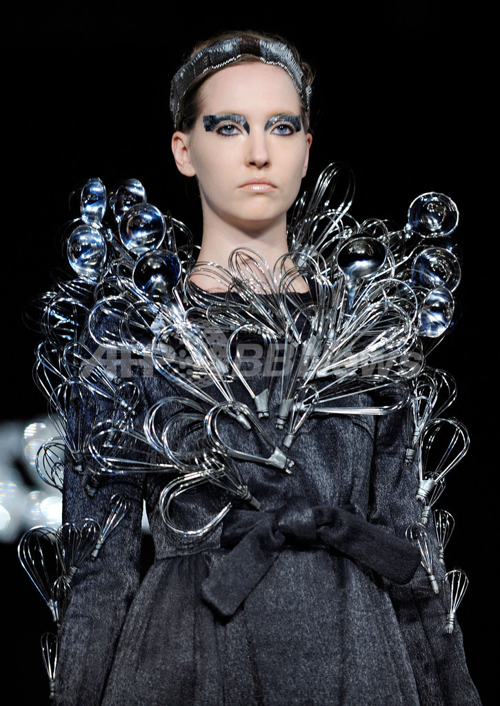 ランウェイには、東京コレクションに参加している2ブランド「ガッツ ダイナマイト キャバレーズ(GUT'S DYNAMITE CABARETS)」と「カミシマ チナミ(KAMISHIMA CHINAMI)」による、調理器具を使用してデザインした作品が発表された。(c)AFP