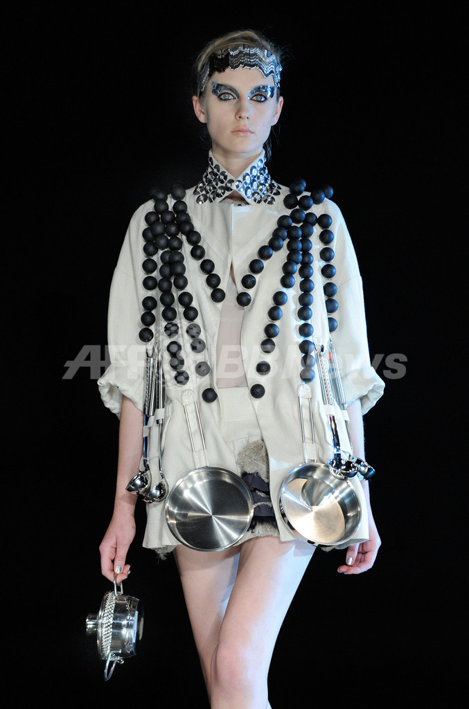 ランウェイには、東京コレクションに参加している2ブランド「ガッツ ダイナマイト キャバレーズ(GUT'S DYNAMITE CABARETS)」と「カミシマ チナミ(KAMISHIMA CHINAMI)」による、調理器具を使用してデザインした作品が発表された。(c)AFP
