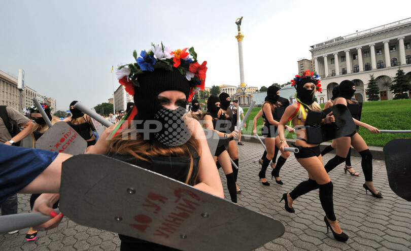 【6月4日 AFP】ウクライナの首都キエフ(Kiev)の独立広場で3日、記者やカメラマンたちに襲いかかる、警官隊?の女性たち。彼女らは女性権利活動団体「FEMEN」のメンバーで、ビクトル・ヤヌコビッチ(Viktor Yanukovych)大統領就任100日目にあたるこの日、民主主義や報道の自由の制限に抗議して、「100日間」と称するデモンストレーションを行った。(c)AFP