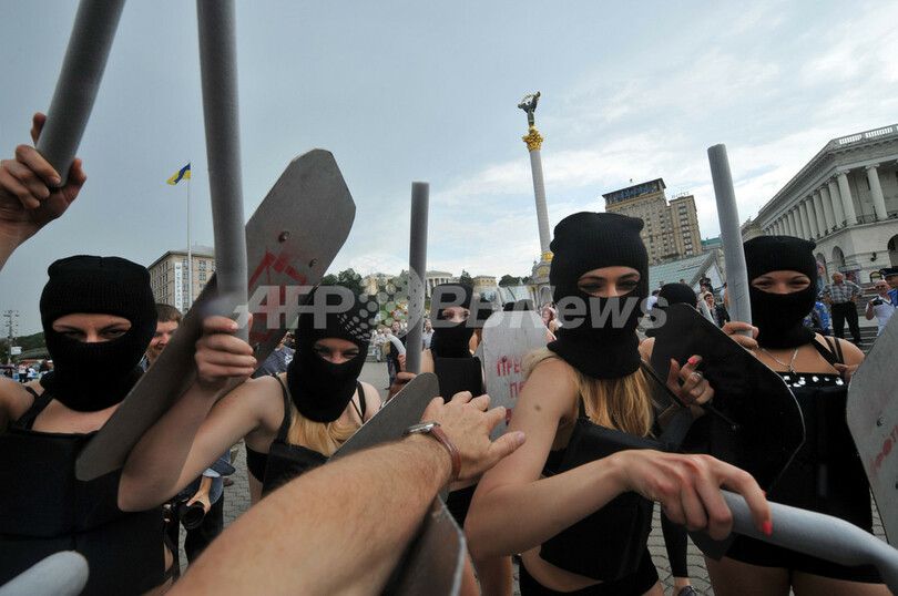 【6月4日 AFP】ウクライナの首都キエフ(Kiev)の独立広場で3日、記者やカメラマンたちに襲いかかる、警官隊?の女性たち。彼女らは女性権利活動団体「FEMEN」のメンバーで、ビクトル・ヤヌコビッチ(Viktor Yanukovych)大統領就任100日目にあたるこの日、民主主義や報道の自由の制限に抗議して、「100日間」と称するデモンストレーションを行った。(c)AFP