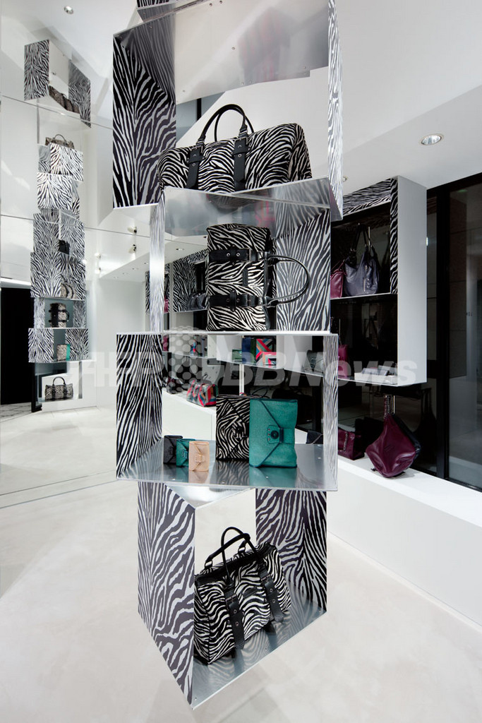 ロンシャン表参道の特徴は、青山通りに面した大きなファサードに大胆なフラッシュを発するストロボを用いていること。「イベント性のあるおもしろいショップという依頼を受け、ケイト・モス、モデル、撮影スタジオとイメージを発展させ、強い光のフラッシュでパーティやフォトセッションなど華やかな場面を彷彿させるものに仕上げました」とブティックのデザインを担当したグエナエル・ニコラ(Gwenael Nicolas)。その光で街行く人を瞬時に引き付けるという“スピード感”も重視したと語る。