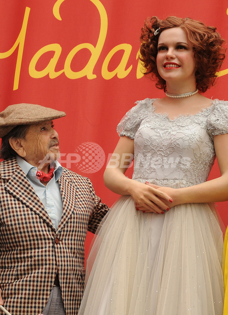 映画『オズの魔法使い(The Wizard of Oz)』のドロシー(Dorothy)役で有名な女優ジュディ・ガーランド(Judy Garland)のろう人形が8日、米ハリウッド(Hollywood)のマダム・タッソー(Madame Tussauds)ろう人形館で公開された。69年に死去したガーランドは、生きていれば10日に88歳となる。写真は、ガーランドのろう人形を見つめる『オズの魔法使い』の共演者ジェリー・マレン(Jerry Maren、2010年6月8日撮影)。(c)AFP/ROBYN BECK