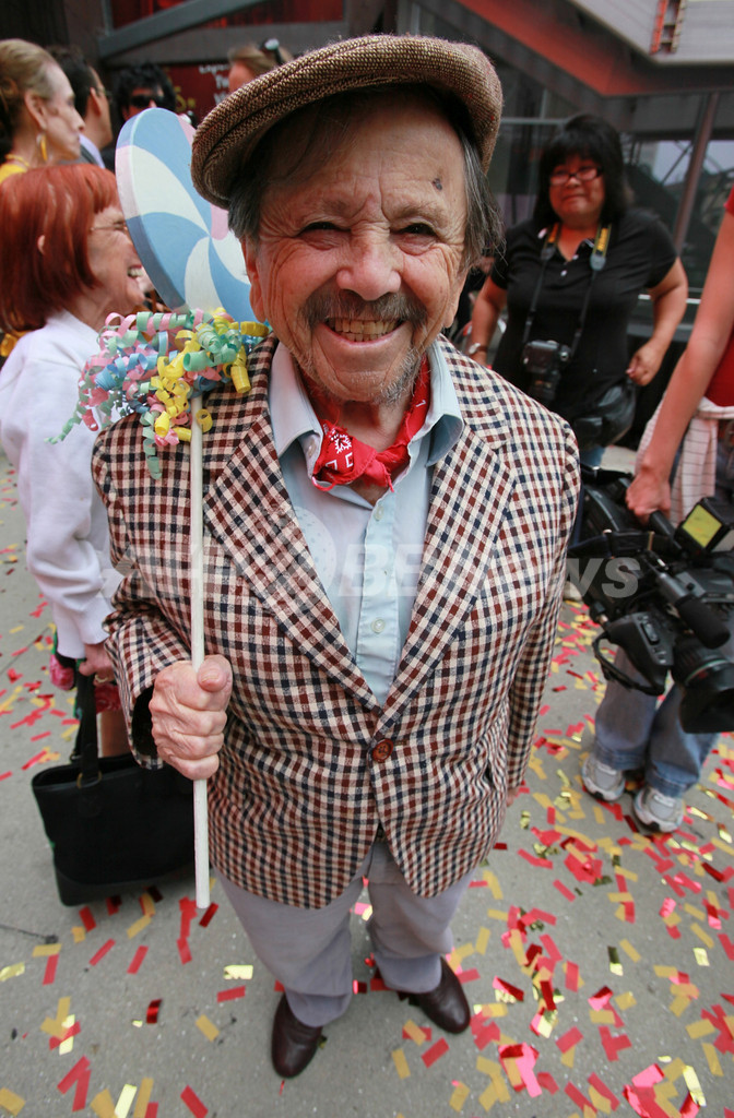 映画『オズの魔法使い(The Wizard of Oz)』のドロシー(Dorothy)役で有名な女優ジュディ・ガーランド(Judy Garland)のろう人形が8日、米ハリウッド(Hollywood)のマダム・タッソー(Madame Tussauds)ろう人形館で公開された。69年に死去したガーランドは、生きていれば10日に88歳となる。写真は、公開イベントに参加した、『オズの魔法使い』の共演者ジェリー・マレン(Jerry Maren、2010年6月8日撮影)。(c)AFP/Getty Images/David Livingston