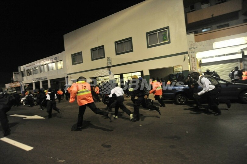 AFP特派員によると、騒ぎが起きたのは試合終了から約1時間半後。スタジアムのメーンゲートの外で、250ランド(約3000円)の日当が190ランド(約2270円)に減額されたとして会場スタッフらが抗議を始めた。これに機動隊数十人が介入し、催涙弾を発射したり、参加者を拘束するなどして抗議行動をやめさせた。(c)AFP