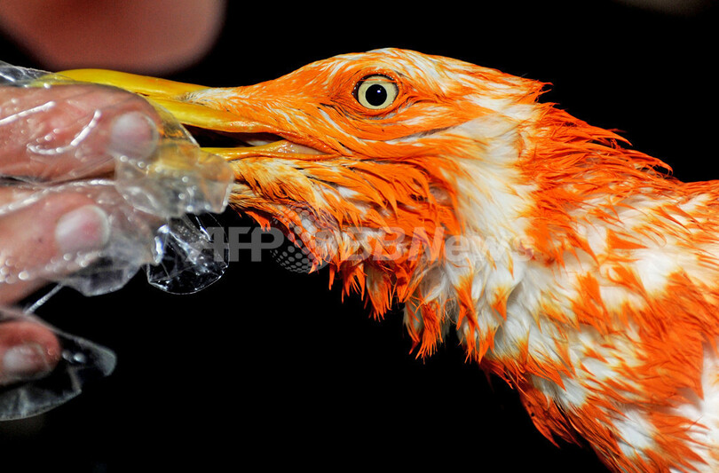 【6月14日 AFP】オランダのミデルブルグ(Middelburg)で10日、全身オレンジ色にペイントされたカモメが鳥類保護センターに保護された。2010年サッカーW杯南アフリカ大会(2010 World Cup)に出場中のオランダ代表チームを応援するために、サポーターらがカモメにペイントをしたとみられている。(c)AFP