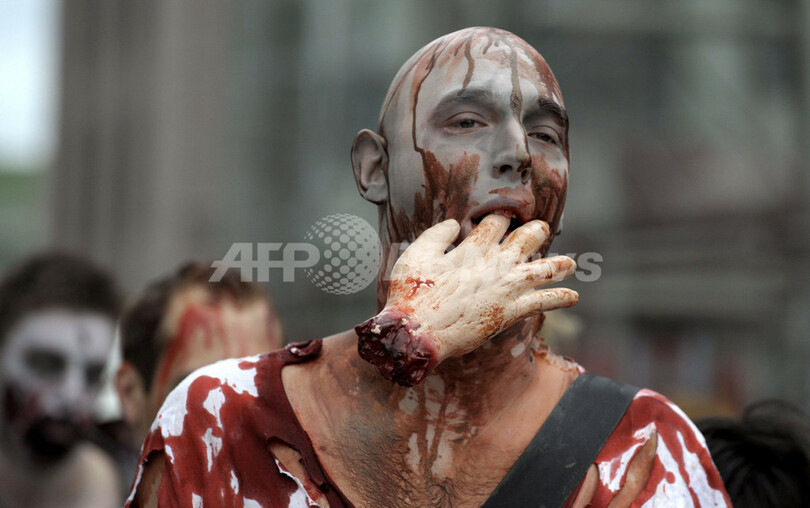 【6月14日 AFP】スウェーデン・ストックホルム(Stockholm)中心部で12日、「ゾンビ・ウォーク(Zombie walk)」が開催された。今年で2回目を迎えるこのイベントは、米ソーシャルネットワーキングサービス(SNS)大手フェースブック(Facebook)上で呼びかけられたもの。「ゾンビ」たちは通りを練り歩いた後、市内のオブセルヴァトリエルンデン公園(Observatorielunden Park)でピクニックを楽しんでイベントを終えた。(c)AFP