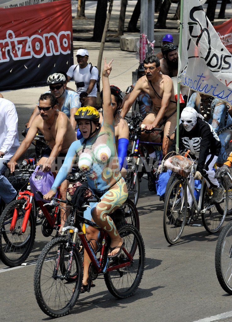 【6月14日 AFP】裸で自転車に乗って環境保護などを訴える恒例の世界同時行動「ワールド・ネーキッド・バイク・ライド(World Naked Bike Ride)」が行われた12日、メキシコのメキシコ市(Mexico City)でも裸のサイクリストたちが一斉に市内を走った。(c)AFP